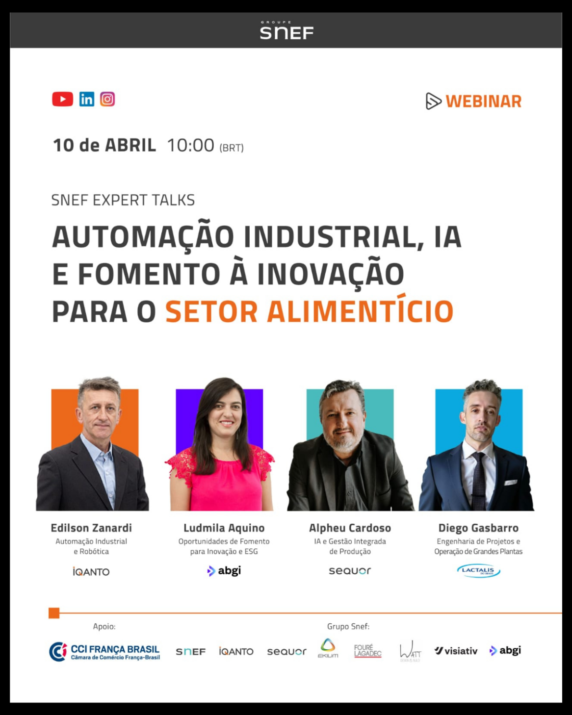 A iQanto, referência em automação industrial e robótica, a Sequor, especialista em transformação digital e inteligência artificial, e a ABGi, líder em estratégias de fomento à inovação, fazem parte do grupo SNEF e convidam você para um webinar exclusivo. Descubra como potencializar a eficiência produtiva e obter incentivos para a aquisição de tecnologias estratégicas que impulsionam o desenvolvimento econômico do setor alimentício.