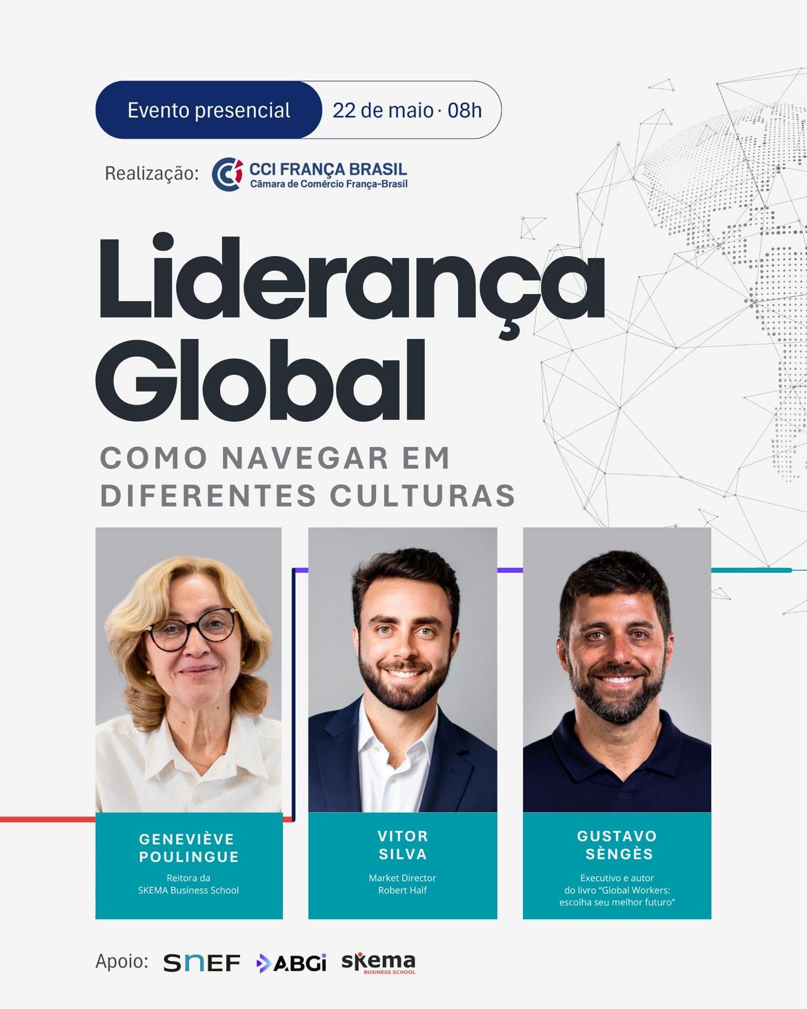 Com a participação de profissionais renomados como Geneviève Poulingue (SKEMA Business School), Vitor Silva (Robert Half) e Gustavo Senges (autor de Global Workers), serão exploradas práticas de gestão multicultural, técnicas de recrutamento internacional e caminhos para a construção de uma carreira global.