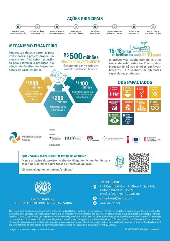 O Projeto ACTION, desenvolvido pela Organização das Nações Unidas para o Desenvolvimento Industrial (UNIDO), em parceria com o Ministério do Desenvolvimento, Indústria, Comércio e Serviços (MDIC) e o Ministério da Agricultura e Pecuária (MAPA), tem como objetivo impulsionar a produção nacional de fertilizantes de baixo carbono, fortalecendo a economia circular, a bioeconomia e a sustentabilidade agrícola no Brasil.