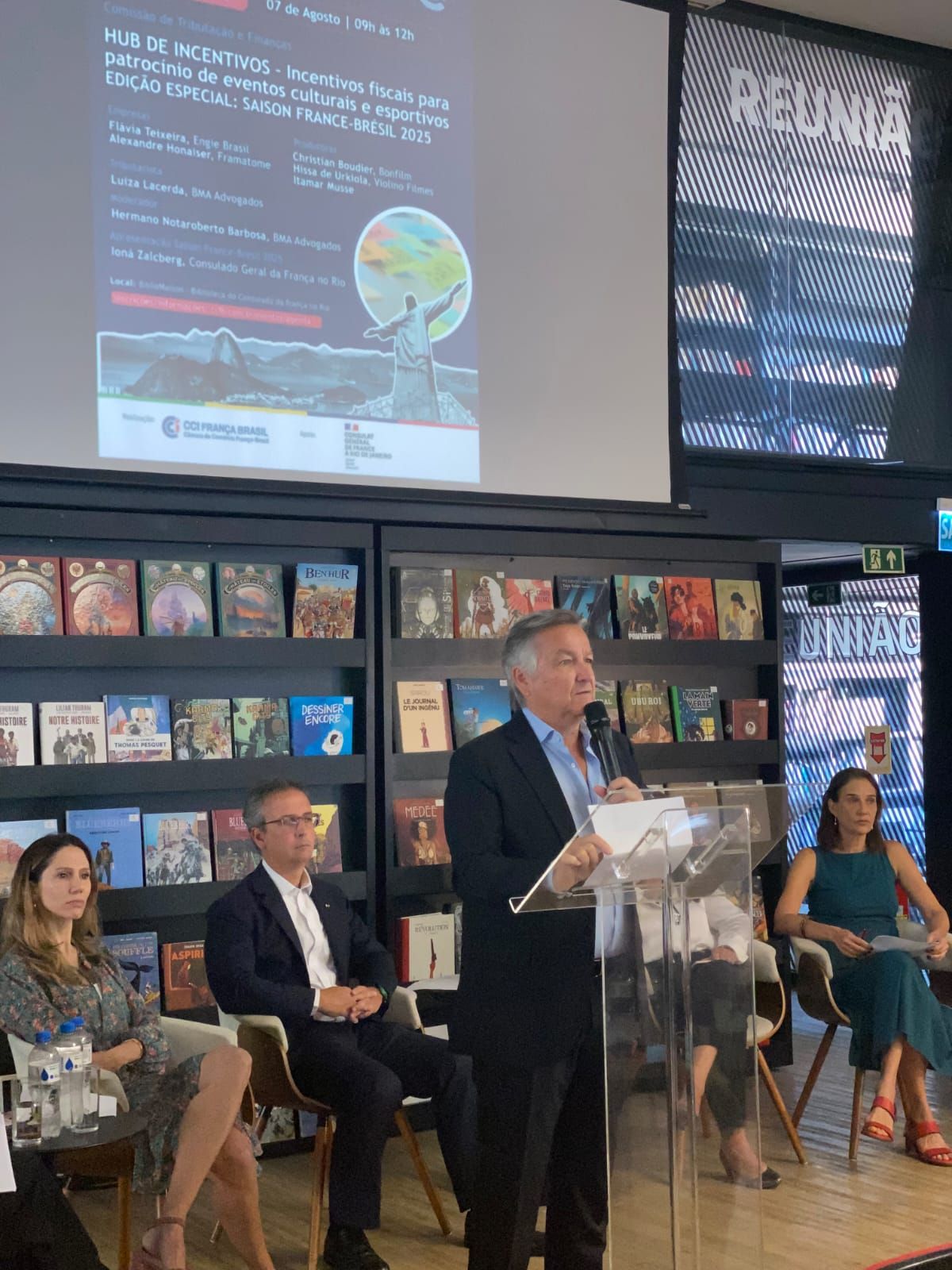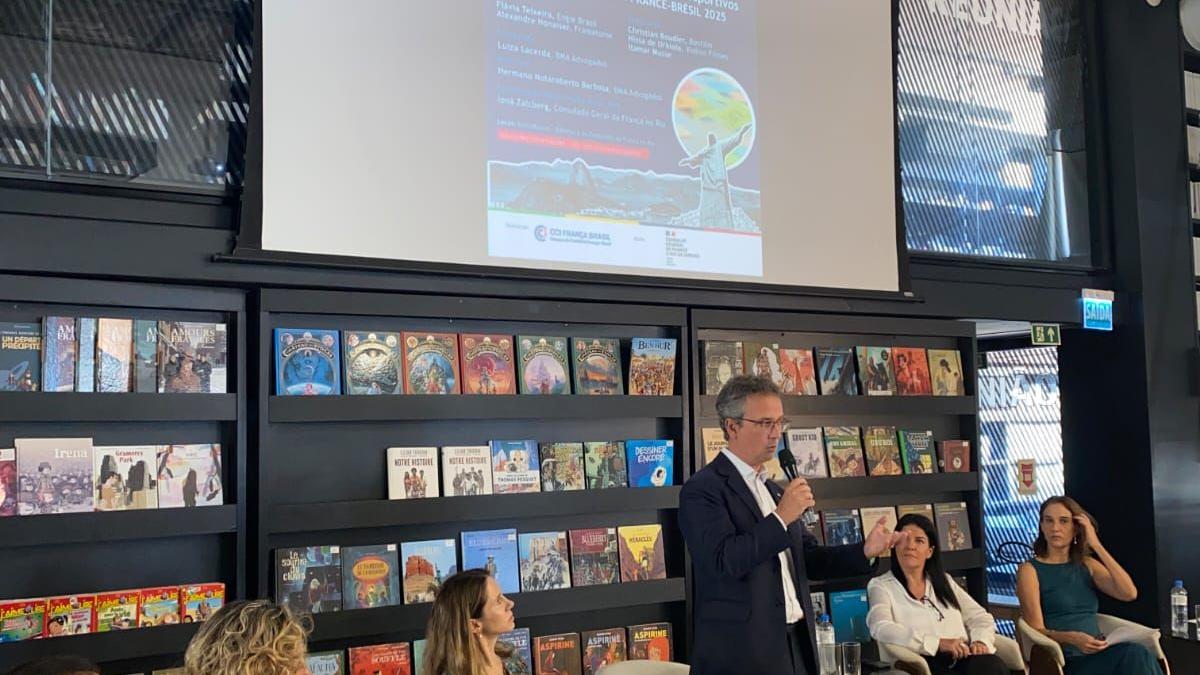 O presidente da CCIFB-RJ, Patrick Sabatier, abriu o encontro. Na sequência, Ioná Zalcberg, representante do Consulado Geral da França no Rio, apresentou a Saison France-Brésil 2025. A moderação foi de Hermano Notaroberto Barbosa, Coordenador da Comissão.
